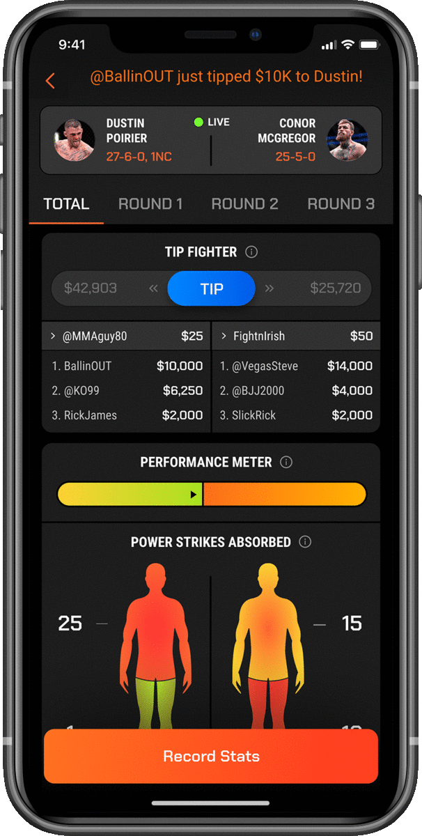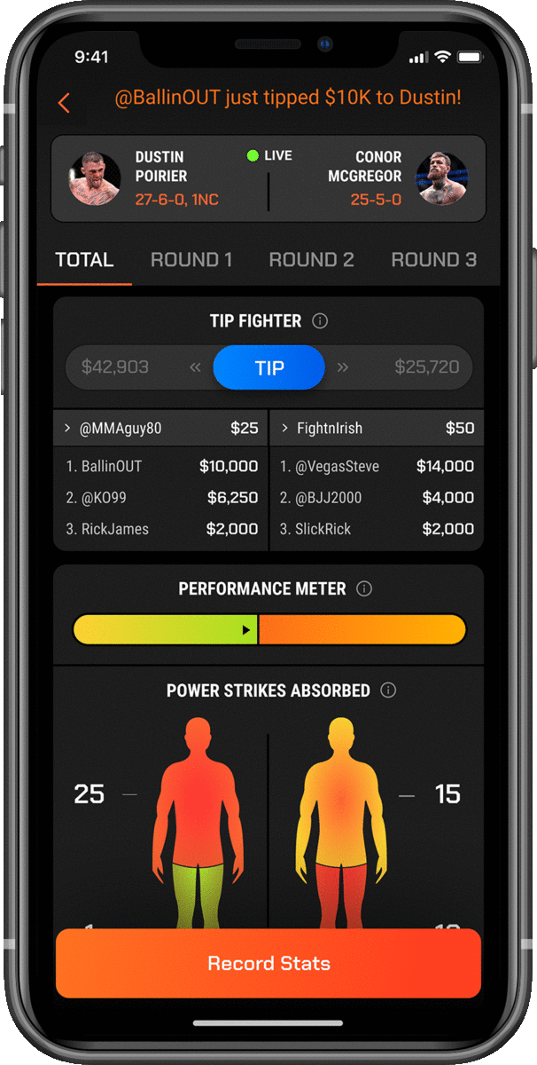 Move the TIP slider towards a fighter to send them a tip instantly via in-app purchase.